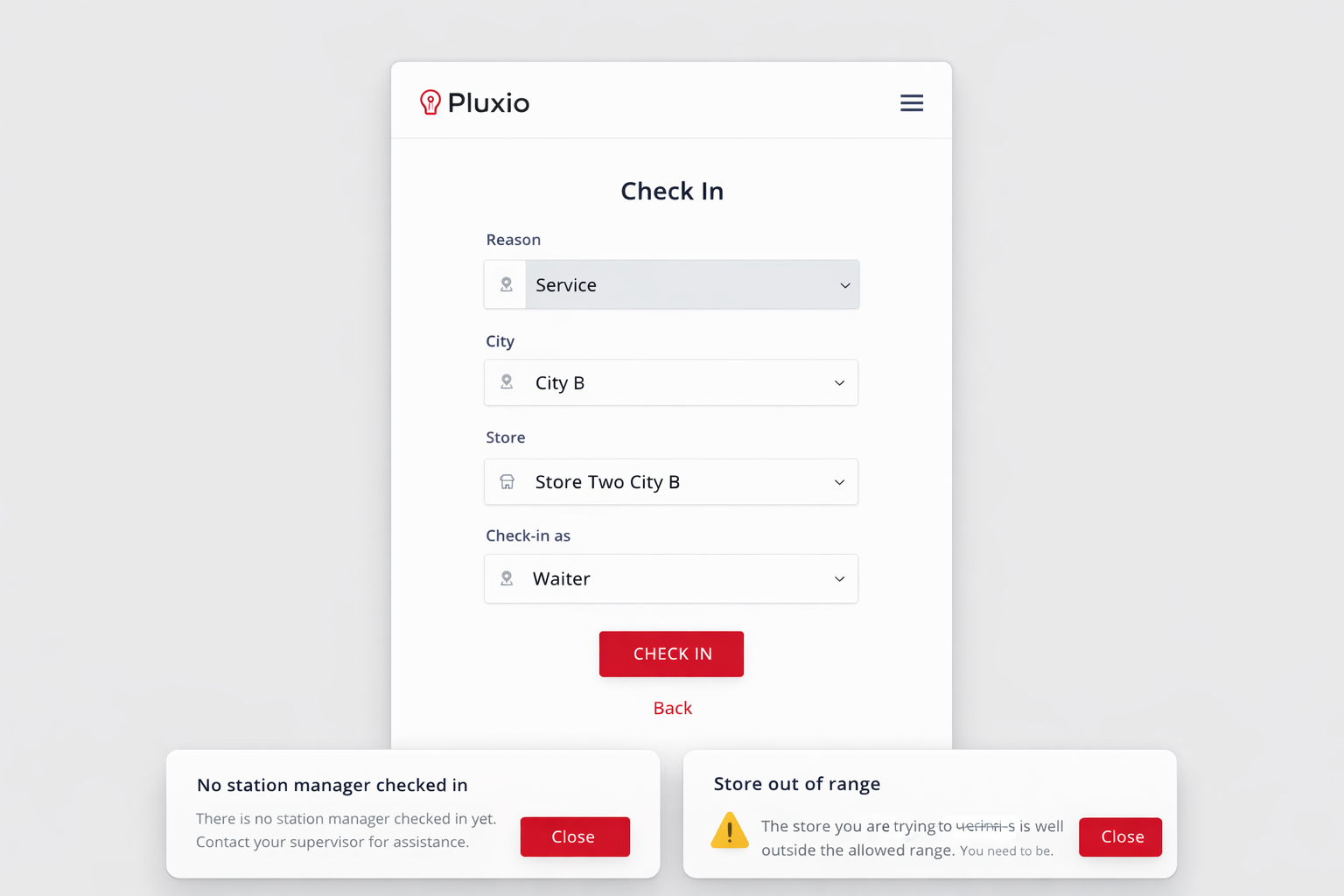 - staff can only clock in/out when physically inside the approved radius of the venue